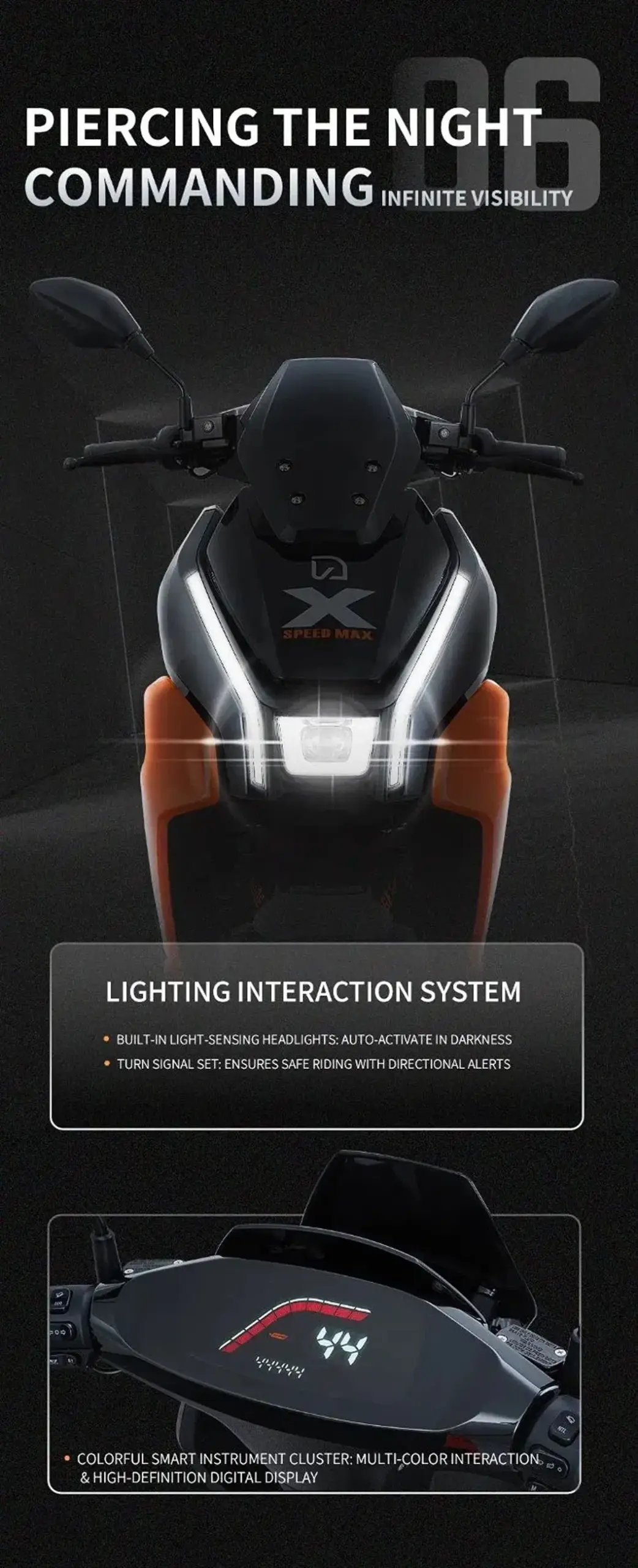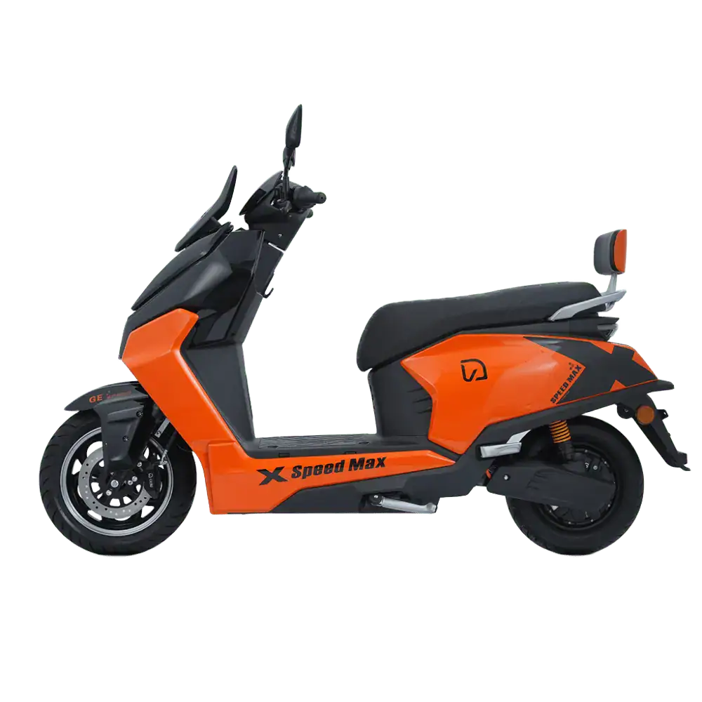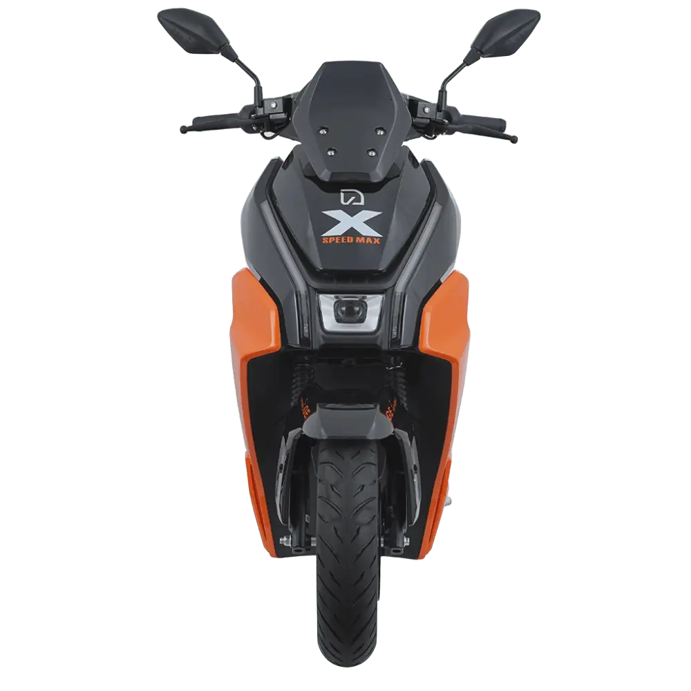 Modern orange and black X-Speed Max electric scooter with energy focus and intelligent driving safety system, featuring advanced radar and collision warning. Performance electric scooter with advanced safety and control features.