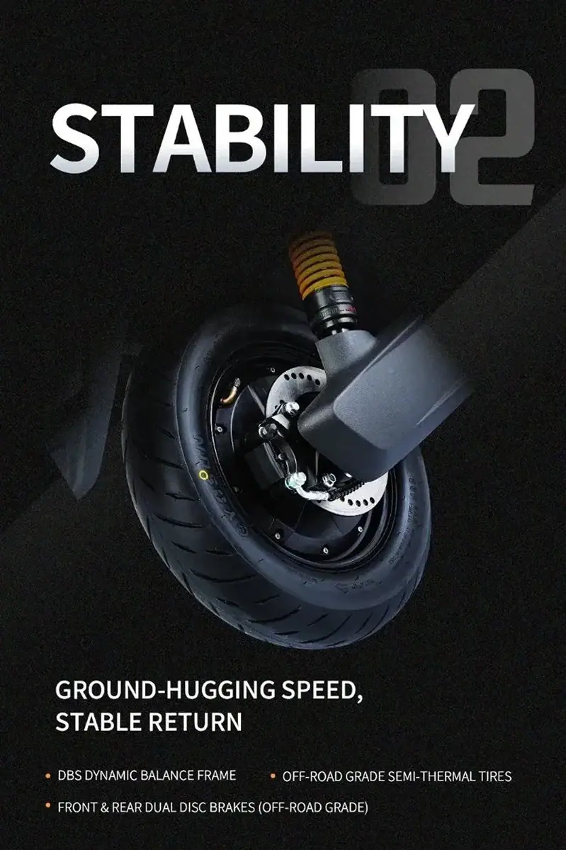 Designed for confidence at high speed, the X-ONE uses an off-road grade chassis and half hot-melt tires to keep the bike planted on the road. The DBS dynamic balance frame, with a 2.5 mm thick carbon cold-rolled steel main beam, ensures excellent rigidity and stability so the bike stays steady at high speed and in sharp corners. Combined with front 12-inch and rear 10-inch vacuum tires, the X-ONE delivers stable starting, smooth riding, and secure braking on both city streets and rougher roads.